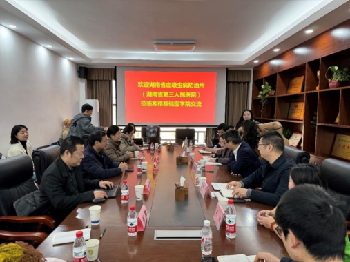 2025年1月17日上午,湖南省血吸虫病防治所(湖南省第三人民医院)所长李博、副所长成美娟一行五人莅临91AV 交流工作。91AV 党委书记王慷慨、副院长刘俊文、副院长黄河出席会议,医学寄生虫学系蒋立平、蔡力汀、张祖萍、黄帅钦、尚晓敏,医学微生物学系刘水平、卢建红、谭宇蓉、余正、孙浪、查安东骨干成员参会交流。