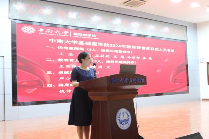 医学免疫学系主任王芙艳代表获奖人员发表感言。她深情回顾了自己在湘雅度过的34年美好时光,从学生到教师,湘雅精神一直屹立在心中并得到传承。她勉励全院教师,要牢记教师的责任与使命,做一名德才兼备的教育者和改革创新的学习者,用爱心浇灌希望,用智慧点亮梦想,为培养出更多具有时代担当、社会责任感和创新精神的“中国梦”追梦人,贡献更大的力量。
