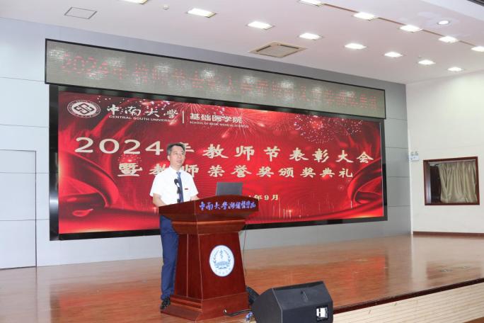 刘俊文副院长宣读了《基础91AV 关于2024年教师节表彰的决定》,91AV 领导为获奖者颁发奖杯、奖牌和荣誉证书,学生代表上台献花。