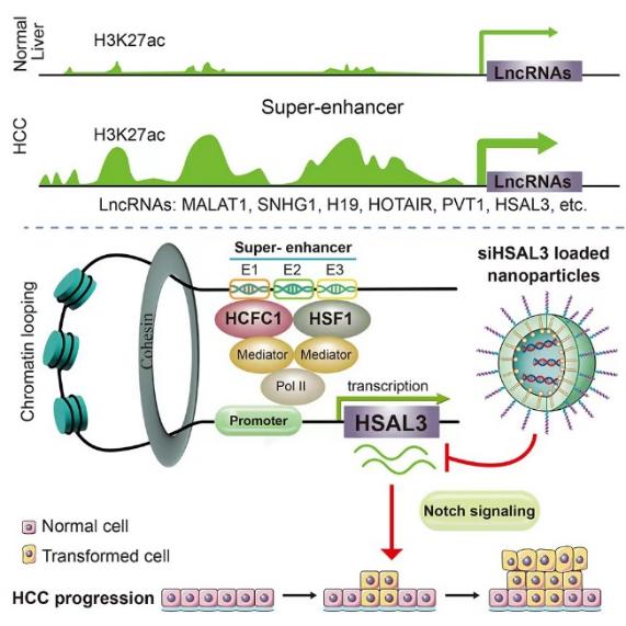 研究首次系统鉴定HCC中与SE相关的lncRNAs。作为一个例子,HSAL3被鉴定为一种未表征的由SE驱动的致癌lncRNA,其转录因子HCFC1和HSF1共同激活。HSAL3在HCC样本中的表达增加,较高的HSAL3表达表明HCC患者的总生存率较低。HSAL3干扰负调节NOTCH信号通路,暗示着其促肿瘤作用的潜在机制。此外,团队通过设计负载siHSAL3的纳米颗粒进行体内外靶向治疗实验,结果显示其HCC具有良好的抗肿瘤效果总之,该项研究工作揭示了锚定SE驱动的致癌lncRNA用于HCC治疗的优,有望为HCC的治疗提供新的潜在靶点和策略