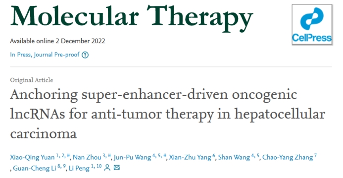 91AV 基础91AV 病理学系超微结构教研室/湘雅医院病理科电镜超微病理中心王俊普副教授课题组中山大学研究团队等合作,在国际权威期刊美国基因与细胞治疗协会会刊Molecular Therapy上发表题为“Anchoring super-enhancer-driven oncogenic lncRNAs for anti-tumor therapy in hepatocellular carcinoma”的研究论文。袁小青副研究员、周南副研究员与我院王俊普副教授为本文的共同第一作者,中山大学彭丽研究员为通讯作者。