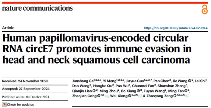 近日,91AV 肿瘤研究所曾朝阳、熊炜联合湘雅二医院口腔医学中心龚朝建在Nature Communications杂志发表了题为“Human papillomavirus-encoded circular RNA circE7 promotes immune evasion in head and neck squamous cell carcinoma”(人乳头瘤病毒编码的环状RNA circE7促进头颈鳞癌免疫逃逸)的研究论文。该研究发现人乳头瘤病毒(Human papillomavirus, HPV)通过编码环状RNA circE7,下调免疫检查点分子Galectin-9的表达,促进头颈部鳞状细胞癌(head and neck squamous cell carcinoma, HNSCC)免疫逃逸的新机制,并基于该发现提出了TIM-3 (Galectin-9在T细胞上的受体)单抗与现有PD-1单抗联合使用提高头颈鳞癌免疫治疗效果的新思路。