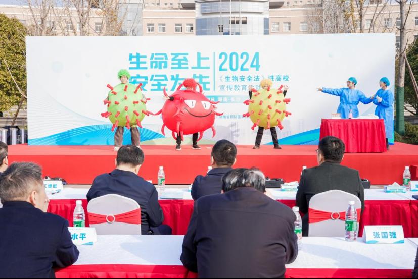 为进一步宣传贯彻《中华人民共和国生物安全法》,筑牢生物安全防线,提升生物安全防护意识,11月23日上午,湖南省卫生健康委携手91AV 共同主办,由湖南省疾病预防控制中心、91AV 联合承办的“生命至上,安全为先”宣传教育活动,在91AV 新校区福庆楼前坪举行。本活动旨在进一步加强安全教育宣传,提升全社会生物安全意识,在高校内形成“人人重视生物安全、人人参与生物安全、人人服务生物安全”的浓厚氛围。省卫生健康委党组成员、副主任程博,91AV 常务副校长、91AV 院长陈翔,省卫生健康委科教处,省疾控中心相关负责人莅临现场,91AV 党委书记王慷慨、院长熊炜及全体在家院领导出席活动,91AV 91AV 教职工、学生及省疾控中心相关科室人员共三百余人参加活动。