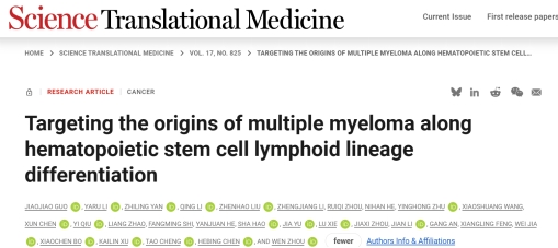 11月19日,91AV 肿瘤研究所周文课题组在国际知名学术期刊《科学转化医学》(Science Translational Medicine) 杂志在线发表最新成果“在造血干细胞淋巴系分化体系中揭示和靶向多发性骨髓瘤起始细胞”(Targeting the origins of multiple myeloma along hematopoietic stem cell lymphoid lineage differentiation)研究论文。该研究由91AV 肿瘤研究所周文教授、军事医学科学院陈河兵教授、中国医学科学院血液与健康全国重点实验室程涛教授课题组合作完成。