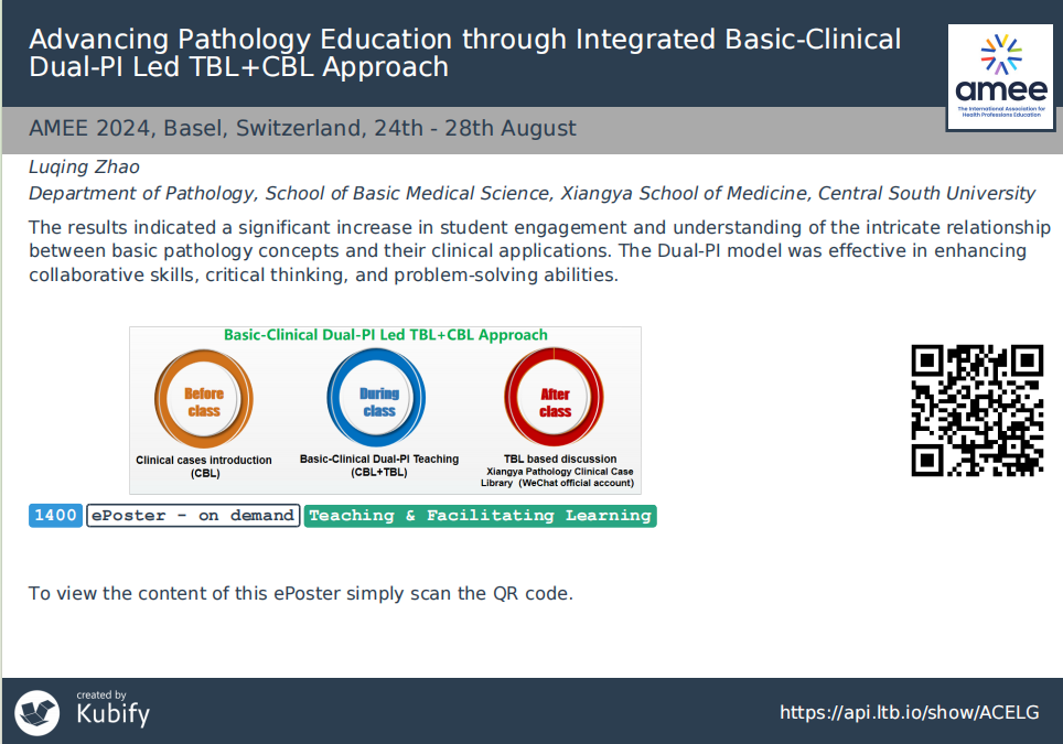 同期,在基础91AV 教师教学发展中心及国际化交流小组的大力支持和资助下,赵璐晴老师作为欧洲医学教育协会会员(AMEE Full Member),在线参加了欧洲医学教育协会AMEE 2024 annual meeting(2024年8月24日-28日 瑞士巴塞尔)。欧洲医学教育协会是全球最大、极具影响力的医学教育学术组织,每年举办的AMEE年会是医学教育领域的盛事,吸引了来自世界各地的医学教育专家、学者和实践者参与,本届AMEE年会的主题是“Develop your educational career: connect, grow and inspire with AMEE 2024”。赵璐晴老师的病理学教学研究成果《Advancing Pathology Education through Integrated Basic-Clinical Dual-PI Led TBL+CBL Approach》入选2024 AMEE年会电子壁报展示,与世界各地的医学教育专家共同交流医学教育相关的研讨和分享经验。