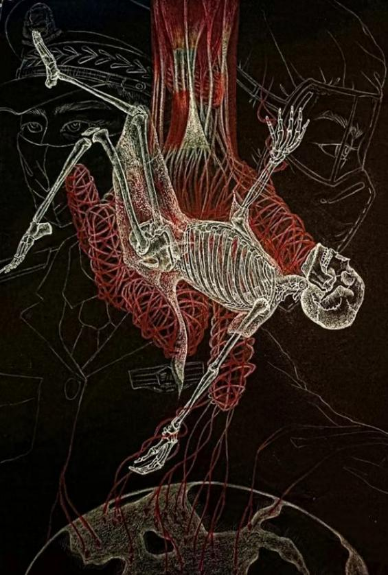 作品介绍:不朽代表的是永不磨灭,本幅作品的主体物白骨与背景抗疫主要人物医生和警察相呼应,代表着无数牺牲在抗疫前线的人民,他们坚持不懈,坚守前线精神的永不磨灭;由红色线条围绕着的大手撑起白骨代表无数中国人民如同红线凝聚在一起,众志成城是抗疫最强硬的后盾,中国的团结是永不磨灭的;下方红线被传递到世界各地,代表中国援助其他国家共同抗疫,倡导人类命运共同体意识的永不磨灭。
