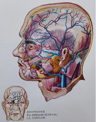 作品介绍:该作品临摹于《奈特人体解剖图谱》面部和头皮的超级动脉和静脉,描述了人体面部与头皮的动静脉及其走行分布,这些血管对人体起着重要的作用。用水彩画的形式不仅表现该处解剖结构,还展现了人体解剖的美学价值。医学的发展离不开人体解剖,将人体解剖以画作的形式呈现,呼吁大家了解面部与头皮的动静脉,引起人们对健康的重视,进而推进健康事业的发展。