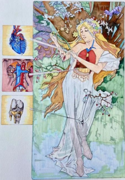 作品介绍:本幅作品将穆夏笔下的少女与解剖学知识相结合,通过手绘的形式不仅夯实解剖学基础,展现艺术风采。同时也将春天的气息淋漓尽致地展现,绿色,代表生命不息。