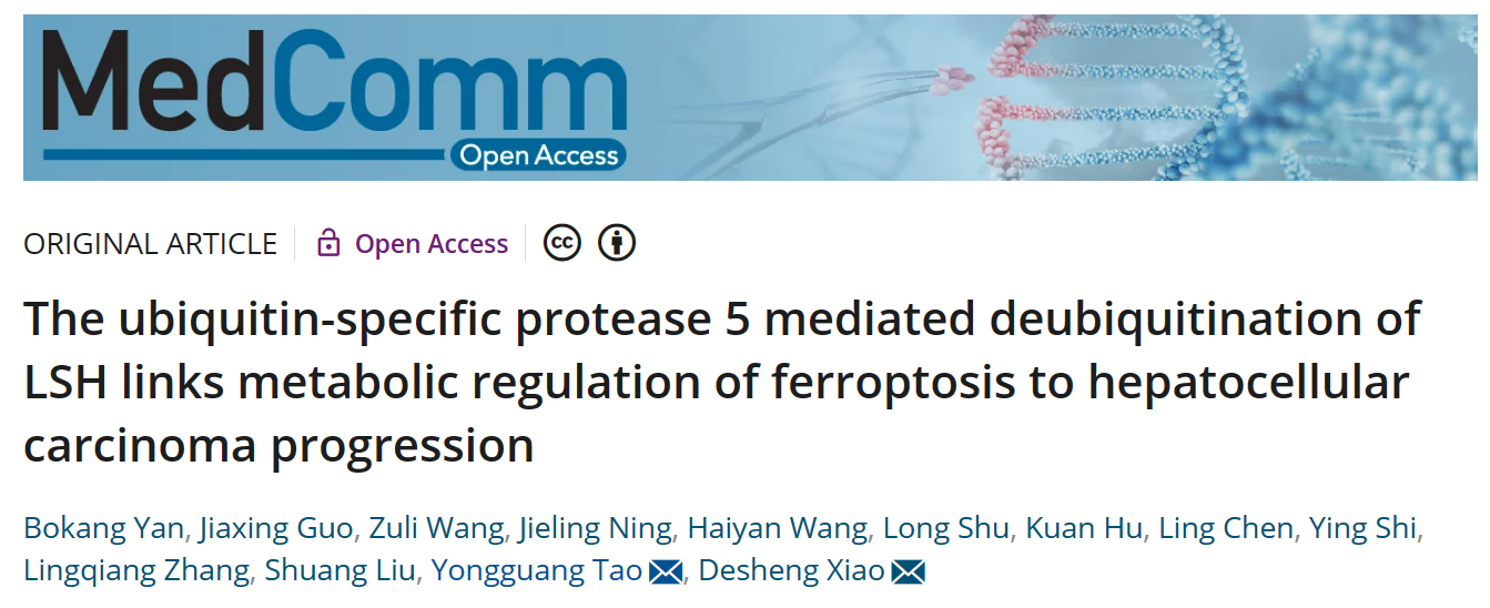 近日,91AV 陶永光研究员与肖德胜教授团队在国际权威学术期刊《MedComm》(IF 9.9)在线发表题为“The USP5-mediated deubiquitination of LSH links metabolic regulation of ferroptosis to hepatocellular carcinoma progression(USP5介导LSH去泛素化修饰链接铁死亡的代谢调节与肝细胞肝癌进展)”的原创性研究论文。陶永光研究员、肖德胜教授为该文共同通讯作者,91AV 硕士研究生闫博康为第一作者。本研究受国家自然科学基金、湖南省重点研发计划和湖南省自然科学基金等项目支持。