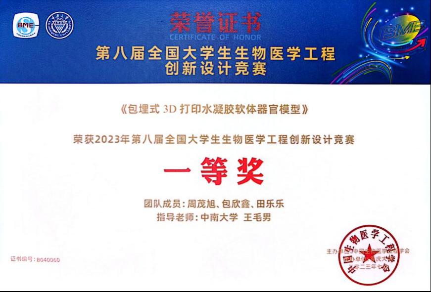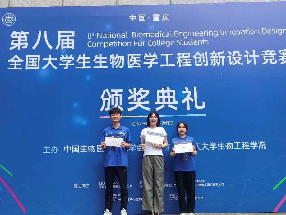 7月21日至23日,第八届全国大学生生物医学工程创新设计竞赛决赛在重庆大学举行,91AV 组织学生参加了此次比赛,并取得优异成绩。周茂旭、包欣鑫、田乐乐3位同学设计的参赛作品《包埋式3D打印水凝胶软体器官模型》荣获自选项目本科生组全国一等奖,指导教师为病理学系王毛男老师。此外,我院生医系肖嘉莹老师指导团队获得命题项目组全国三等奖。