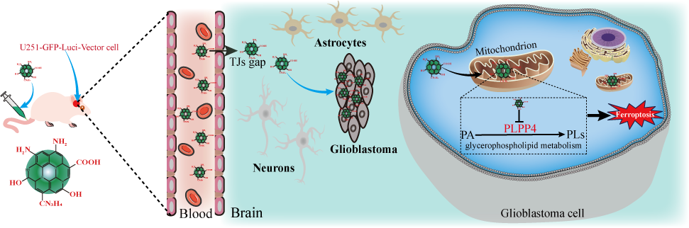 没食子酸作为一种组分中药,已被证明具有抗炎、抗氧化、抗肿瘤、保肝、保肾等生物学效应。研究团队将富含羟基的没食子酸分子与富含氨基的二甲双胍分子通过一锅水热法成功制备出新型碳量子点纳米中药材料(MGA-CDs)。MGA-CDs 不仅显示出卓越的血脑屏障通透性及生物相容性,还具有显著的抗肿瘤活性,可明显抑制小鼠颅内原位脑胶质母细胞瘤的生长。在机制上,MGA-CDs在没有任何额外靶向分子的辅助下即可靶向肿瘤细胞线粒体,导致线粒体皱缩和线粒体嵴数量减少,并诱发肿瘤细胞发生铁死亡。此外,该研究第一次证实了干扰甘油磷脂代谢途径是细胞铁死亡的新机制,其中,PLPP4作为甘油磷脂代谢通路的重要组分介导了MGA-CDs诱导的胶质母细胞瘤细胞的铁死亡。MGA-CDs可通过抑制PLPP4的表达,干扰甘油磷脂代谢途径,从而诱导铁死亡的发生,PLPP4也被证明为铁死亡的新型抑制因子。MGA-CDs的成功研发不仅是对中医药的传承和创新,也是中医药学科与其他学科交叉融合的成果,更是中医药现代化的重要产物。