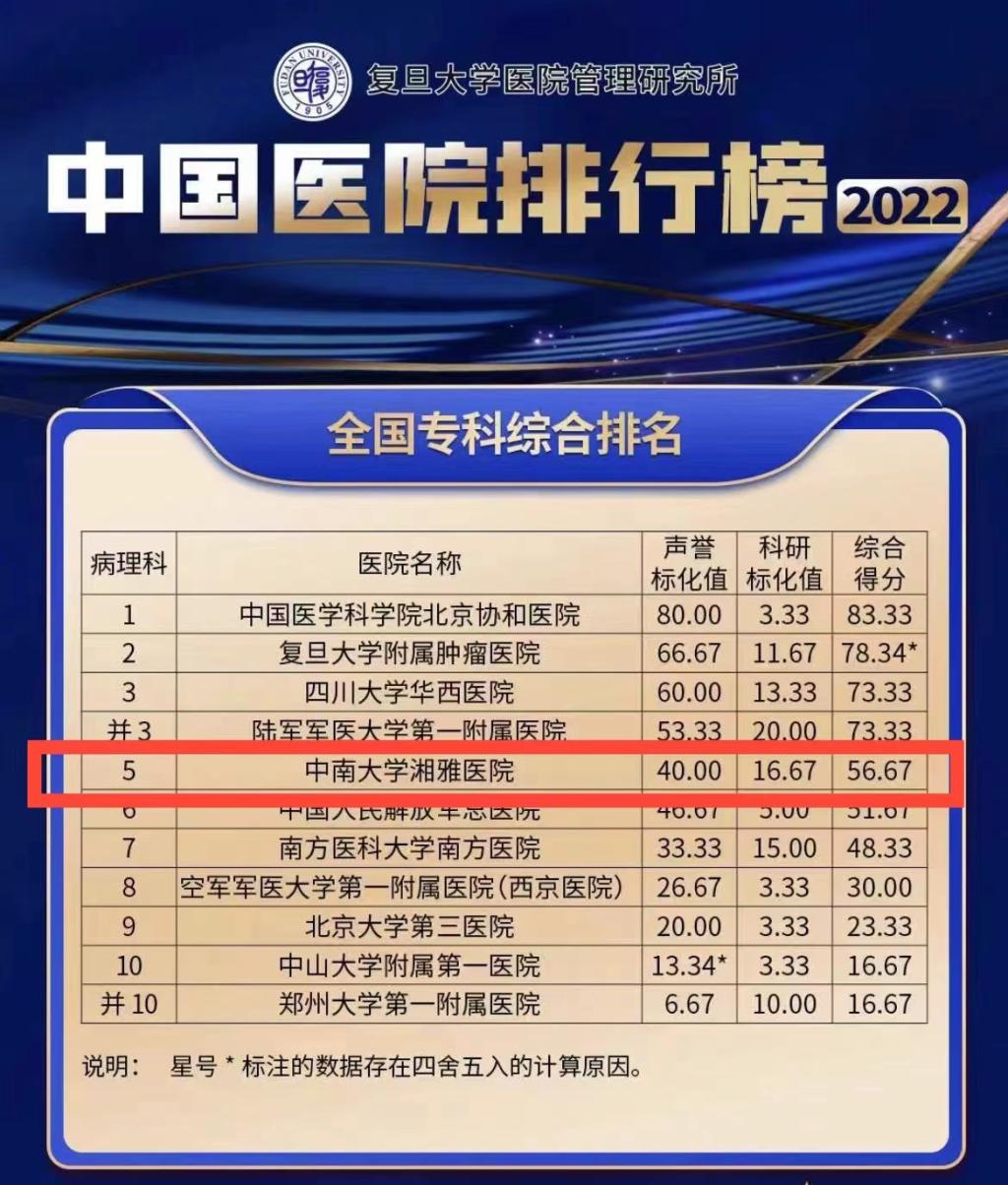 11月25日,复旦大学管理研究所公布了“2022年度中国医院排行榜”,91AV 病理学系/湘雅医院病理科荣登第五位!专科声誉排名全国第六位!