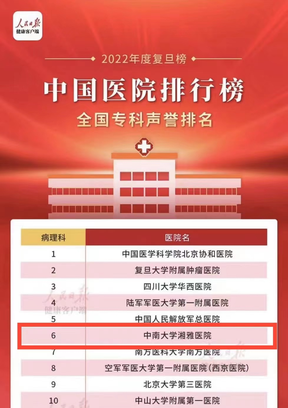 据悉,“中国医院排行榜”是全国范围内最权威的医疗机构排名榜单之一,评估标准包括医疗服务水平、科研实力、医疗质量等多个方面,多年来已成为中国三甲医院考量学科建设、临床与医疗质量、科研水平的重要标杆。湘雅病理继2020年获综合排名全国第九位,2021年综合排名全国第七位的好成绩后,今年再创佳绩,荣登排行榜第五位!再次展现了湘雅病理在学科建设、医疗诊断领域的卓越实力和优质服务。