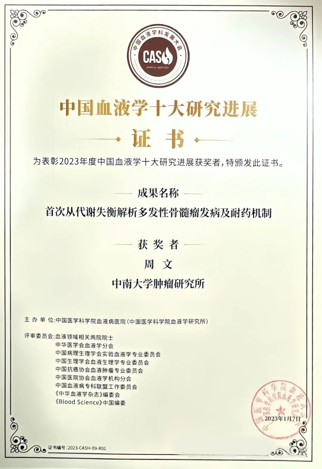 近日,第四届中国血液学科发展大会揭晓了“2023年度中国血液学十大研究进展”,91AV 肿瘤研究所周文教授团队成果“首次从代谢失衡解析多发性骨髓瘤发病及耐药机制”入选。
