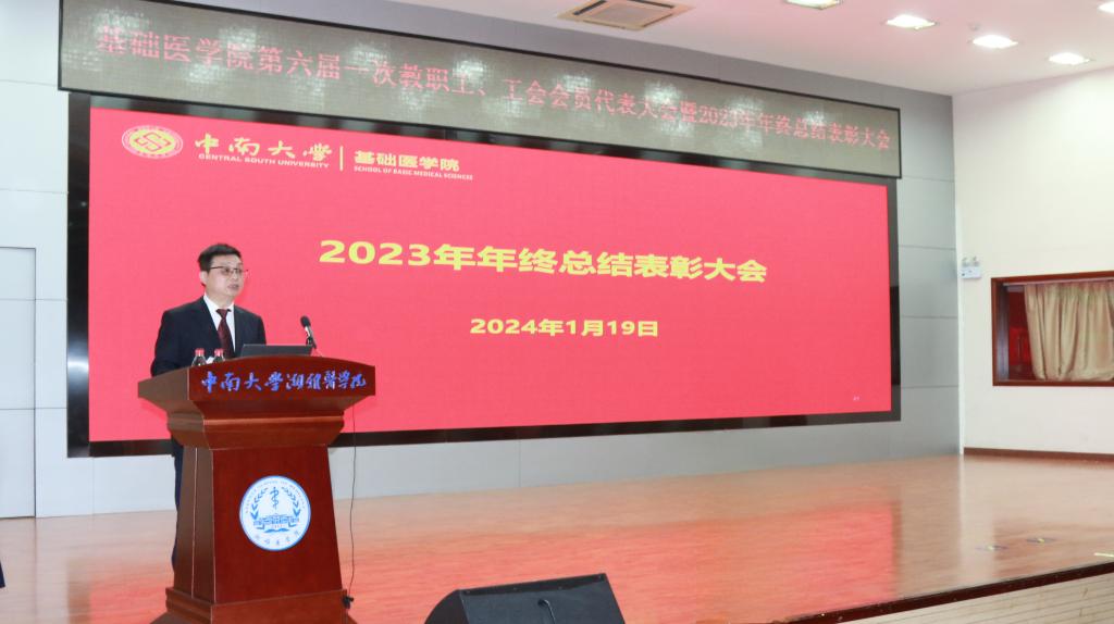 首先,院党委王慷慨书记代表91AV 致辞。他指出,举办简洁而庄重的总结表彰大会,既是为了总结成绩、表彰先进,也是锚定目标、鼓舞斗志。回望2023年,全院师生员工团结进取、凝心聚力,一起苦干实干推动91AV 高质量发展迈入新阶段。展望2024年,期望全体师生向着既定的目标奋跃而上、飞龙在天,赓续湘雅基础医学新辉煌。