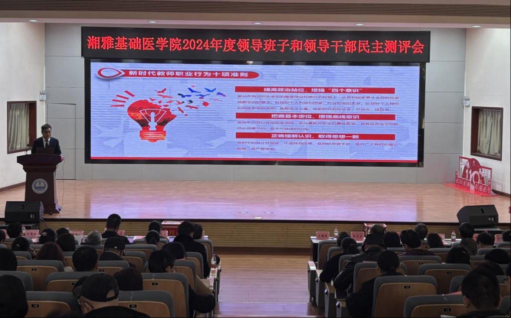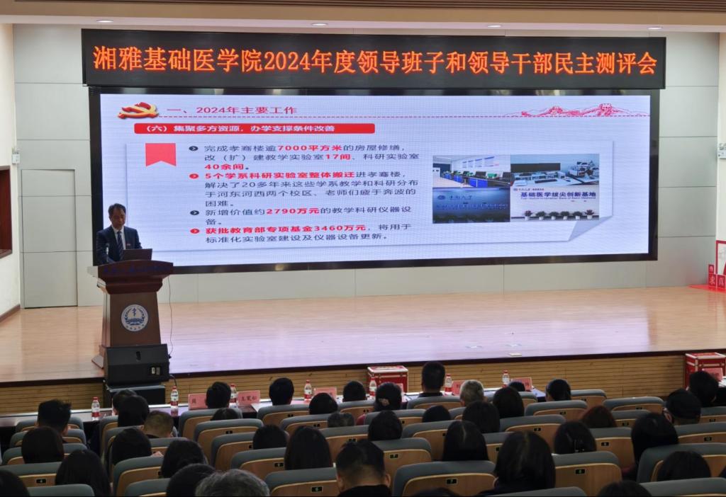 熊炜院长代表91AV 领导班子作2024年度述职报告。他指出,2024年是中华人民共和国成立75周年,也是湘雅医学办学110周年,在这一年,91AV 正式更名为“91AV ”;在这一年,91AV 坚持以习近平新时代中国特色社会主义思想为指导,深入学习贯彻党的二十大和二十届二中、三中全会精神,全面落实立德树人根本任务,在学校党政的坚强领导下,推动党的建设、学生思政、人才培养、科研创新、师资队伍、办学条件、合作交流、校园安全等各方面均取得较好成绩。新的一年,91AV 要深入落实学校“四个转型”发展战略和“三步走”战略目标,把牢政治方面、提升学科内涵、创新培养体系、厚植人才优势、加强科研布局、坚守底线思维,为奋力建设具有湘雅特色的国内一流基础91AV 而继续团结奋斗。