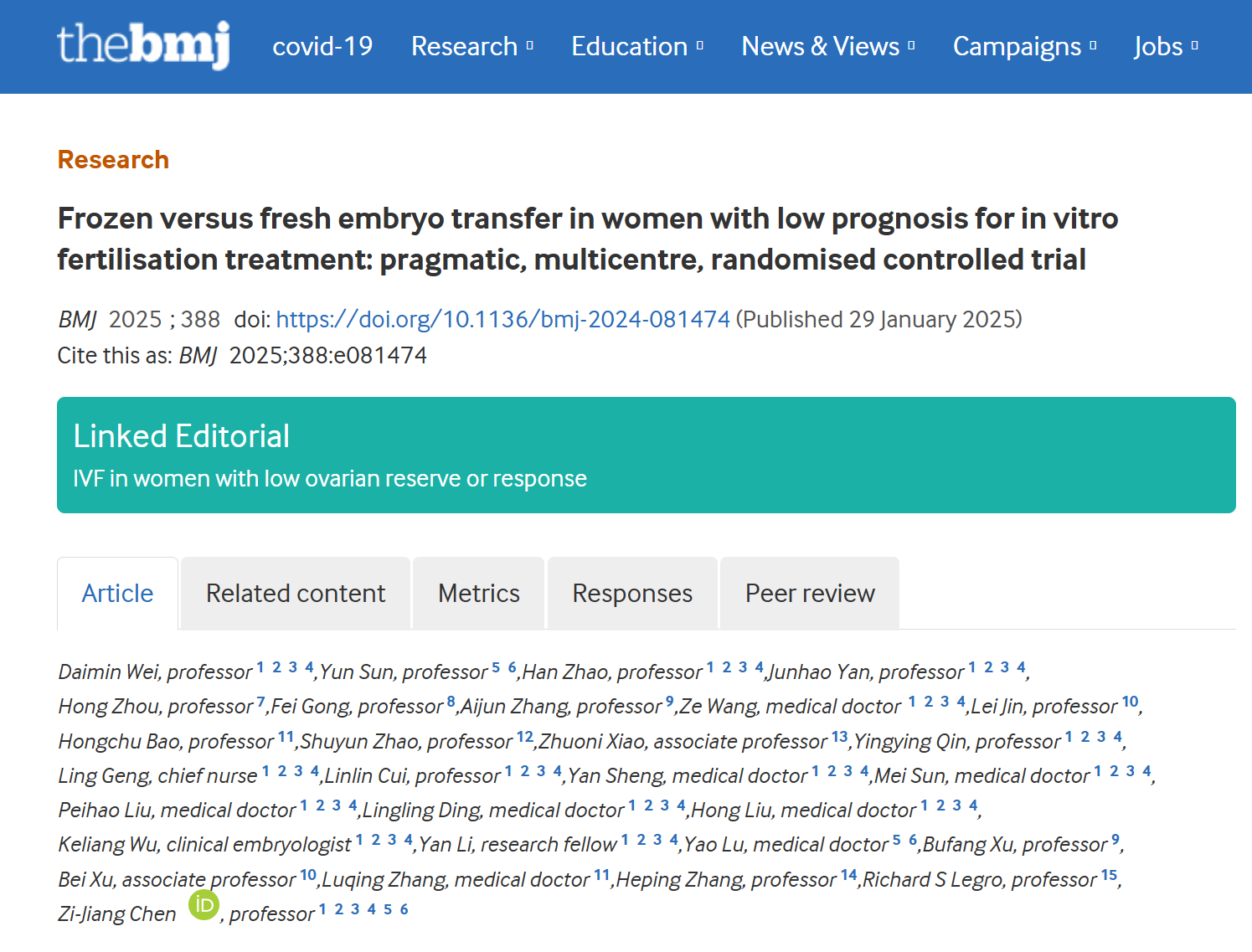 近期,国际顶级医学学术期刊The BMJ《英国医学杂志》发布91AV 生殖与干细胞工程研究所龚斐团队参与的一项多中心、前瞻性随机对照临床研究成果“Frozen versus fresh embryo transfer in women with low prognosis for in vitro fertilisation treatment: pragmatic, multicentre, randomised controlled trial(鲜胚移植可提高预后不佳IVF患者活产率及累积活产率)”。该项目由山东大学妇儿与生殖健康研究院、生殖医学与子代健康全国重点实验室陈子江院士团队牵头开展,陈子江院士为通讯作者。山东大学妇儿与生殖健康研究院魏代敏教授、赵涵教授、颜军昊教授,上海交通大学91AV 附属仁济医院孙赟教授,广西自治区妇幼保健院周红教授,91AV 龚斐副教授为论文共同第一作者。