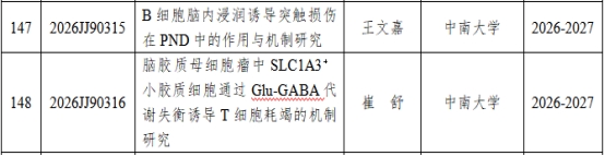 近日,2026年度湖南省自然科学基金青年学生基础研究项目立项名单正式公布,91AV 周勇教授指导的王文嘉同学所申报项目《B细胞脑内浸润诱导突触损伤在PND中的作用与机制研究》,以及武明花教授指导的崔舒同学所申报项目《脑胶质母细胞瘤中SLCIA3+小胶质细胞通过Glu-GABA代谢失衡诱导T细胞耗竭的机制研究》成功立项。学院在本科生科研能力培养方面成效显著。