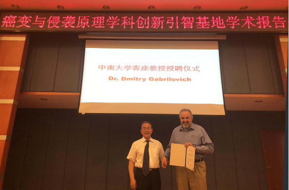 2018年511日,应教育部/国家外专局癌变与侵袭原理高校学科创新引智基地的邀请,美国宾夕法尼亚大学Dmitry Gabrilovich教授在91AV 做学术报告,进行学术交流。引智基地负责人李桂源教授向Gabrilovich教授颁发91AV 客座教授聘书。